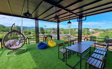 มี rooftop พร้อมมุมถ่ายรูปหลากหลาย มีโต๊ะทานข้าว แบบ Outdoor ให้ได้