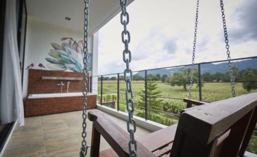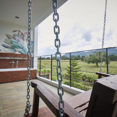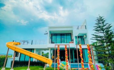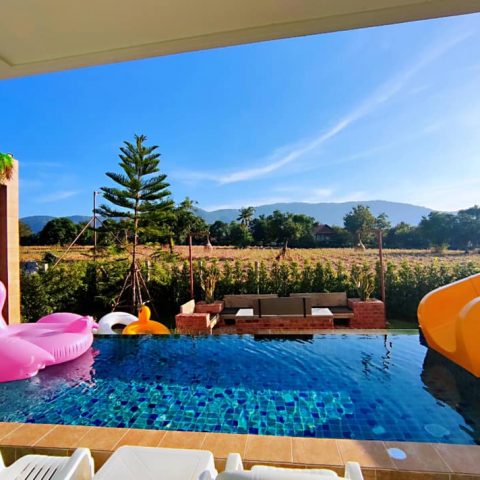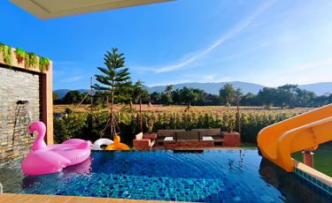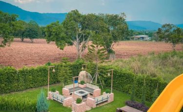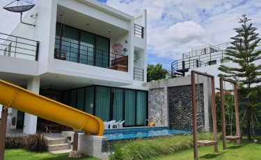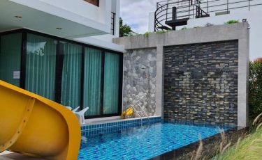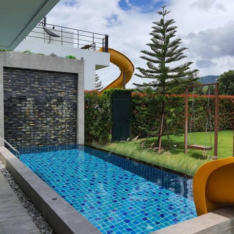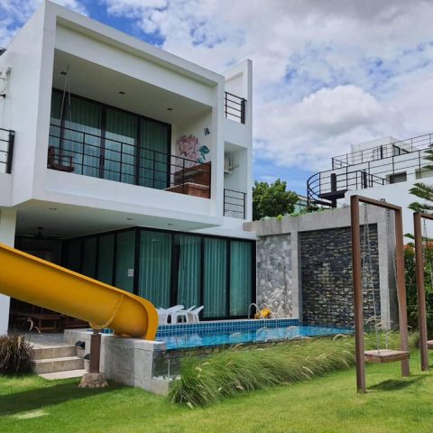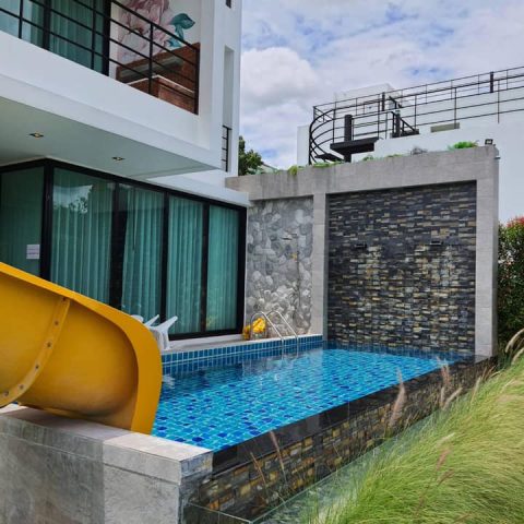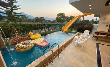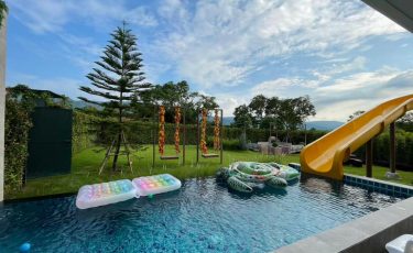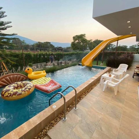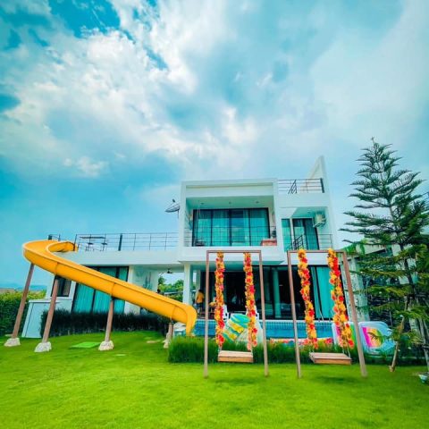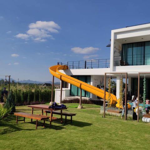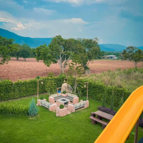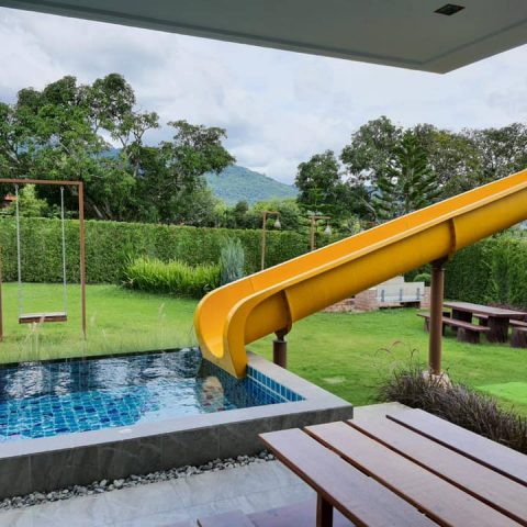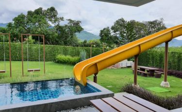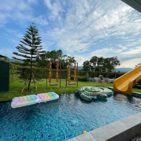 ” Chilling Roof Pool Villa Khaoyai ” บ้านพักตากอากาศ พูลวิลล่าส่วนตัว มีสไลเดอร์ (สูงขนาด ชั้น 2) ออกแบบสไตล์โมเดิร์น เห็นวิวธรรมชาติ ภูเขา บรรยากาศร่มรื่นไปด้วยต้นไม้ สนามหญ้าที่เด็กๆ สามารถวิ่งเล่นออกกำลังกายได้ มีของเล่นสำหรับเด็กให้สนุกเพลิดเพลิน พร้อมมุมนั่งเล่นนอกบ้าน มุมปิ้งย่างบาร์บีคิว มีลมเย็นๆ พัดผ่านเข้ามาในตัวบ้านตลอดทั้งวัน ห้องนอนเห็นวิวภูเขา ริมระเบียงยังมีมุมให้ชมวิว และ อ่างจากุซชี่อีกด้วย ประกอบอาหารได้ มุมถ่ายรูปก็สวย ถือว่าครบเลยที่เดียว