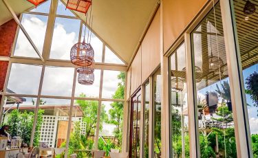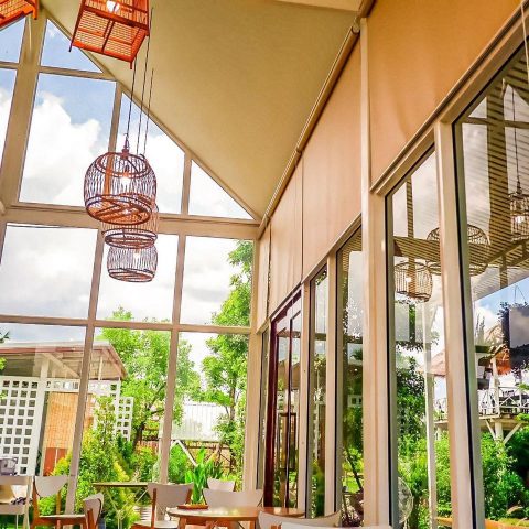 ภายในร้านมีที่นั่งหลากหลายแบบ เพดานสูง ล้อมรอบด้วยกระจกใส ทำให้ความรู้สึกอบอุ่น