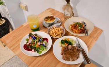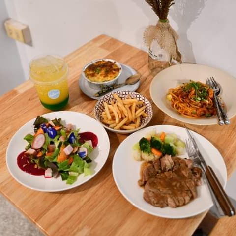 มีให้เลือกทานแบบครบครัน ไม่ว่าจะเป็นอาหารคาว เช่น สเต็ก แซลม่อน พาสต้า หรือจะเป็นของหวานและเครื่องดื่มอย่าง กาแฟ ม็อคเทล ก็มีให้เลือกมากมาย